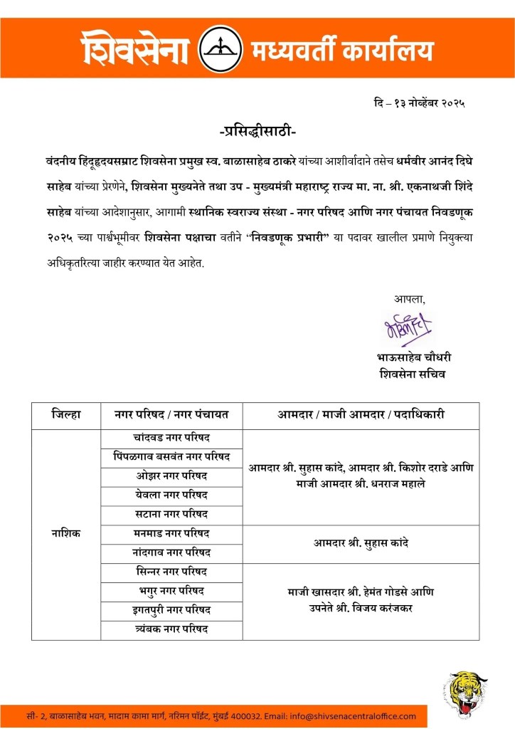 यासह, सिन्नर, भगुर, इगतपुरी आणि त्र्यंबकेश्वर नगर परिषदेसाठी माजी खासदार हेमंत गोडसे आणि उपनेते विजय करंजकर यांची नियुक्ती करण्यात आली आहे.