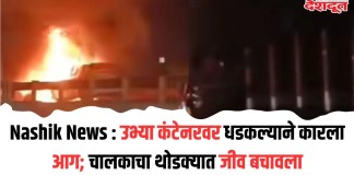 Nashik News : उभ्या कंटेनरवर धडकल्याने कारला आग; चालकाचा थोडक्यात जीव...