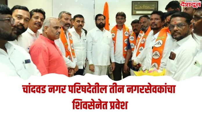चांदवड नगरपरिषद निवडणुकीचा निकाल जाहीर होऊन दहा ते बारा दिवस लोटलेत मात्र राजकीय डावपेच काही थांबायला तयार नाहीत त्यांचाच अनुभव आला तो आज शुक्रवार दि २ जानेवारीला. ठाणे येथे शिवसेना सचिव व उत्तर महाराष्ट्र संपर्क नेते भाऊसाहेब चौधरी यांच्या प्रमुख मार्गदर्शनाखाली चांदवड नगरपरिषद निवडणुकीत निवडून आलेल्या शरद पवारांच्या राष्ट्रवादीचा एक नगरसेवक व दोन अपक्ष अशा तीन नगरसेवकांनी तसेच राजकीय व सामाजिक कार्येकर्त्यानी यांनी राज्याचे उपमुख्यमंत्री व शिवसेना मुख्यनेते एकनाथ शिंदे तसेच खासदार डॉ. श्रीकांत शिंदे यांच्या प्रमुख उपस्थितीत शिवसेना पक्षात जाहीर प्रवेश केला.या प्रवेशाने शिवसेना पक्षांची चांदवड तालुक्यात नक्कीच ताकद वाढली आहे.