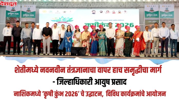 जिल्हा विकास आराखडा नाशिक फेस्टिव्हल अंतर्गत जिल्हा प्रशासन, जिल्हा नियोजन समिती, कृषी विभाग, ‘आत्मा’ आणि माविमच्या संयुक्त विद्यमाने ‘कृषी कुंभ -2026’ चे आयोजन आजपासून यूथ फेस्टिवल मैदानावर सुरू झाले. त्याच्या उद्घाटप्रसंगी जिल्हाधिकारी आयुष प्रसाद बोलत होते. कृषी कुंभचे उद्घाटन राज्य शासनाचे ‘कृषी पुरस्कार’ प्राप्त महिला शेतकऱ्यांच्या हस्ते करण्यात आले.