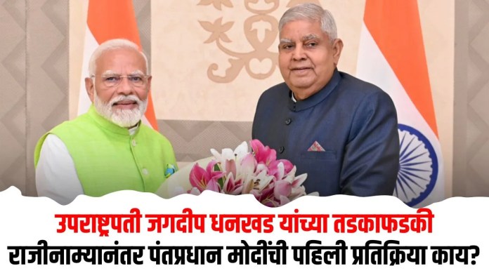 पंतप्रधान नरेंद्र मोदी यांनी जगदपीप धनखड यांच्या राजिनाम्यानंतर सोशल मीडियावर एक पोस्ट शेअर केली आहे. “श्री जगदीप धनखड यांना भारताचे उपराष्ट्रपती यासह अनेक भूमिकांमध्ये देशाची सेवा करण्याची संधी मिळाली आहे. मी त्यांच्या उत्तम आरोग्यासाठी शुभेच्छा देतो” या आशयाची पोस्ट त्यांनी केली.
